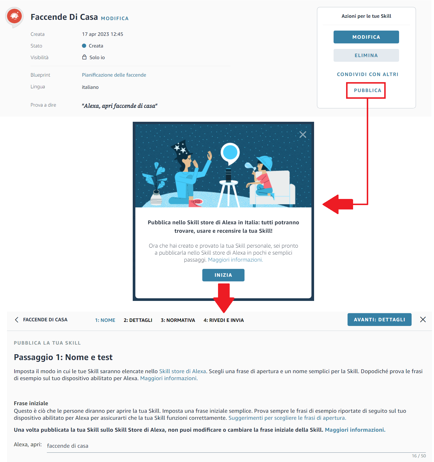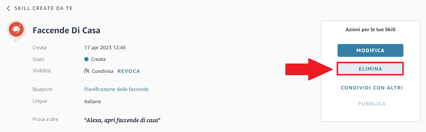 Per pubblicare la skill dovete accedere alla home page di Blueprint Alexa, cliccare in alto su “Skill che hai creato”, selezionare la skill da pubblicare e cliccare su “Pubblica” nelle opzioni di menu. Se la skill è già stata condivisa dovrete prima revocare la condivisione in quanto non più necessaria.