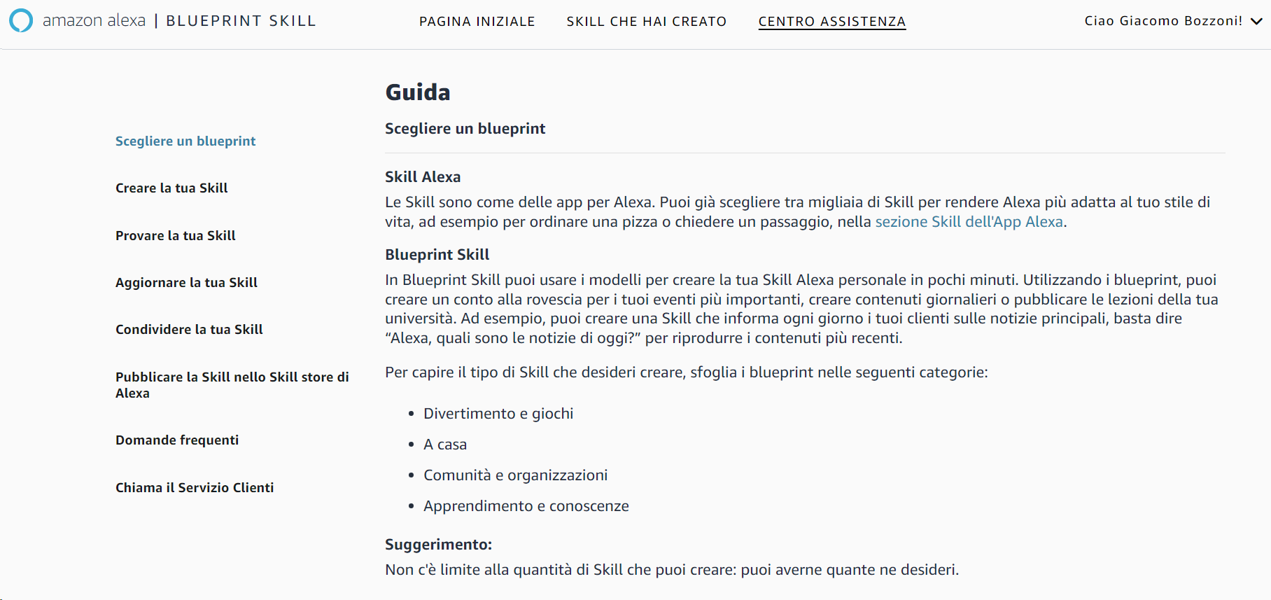 Innanzitutto scegliete un modello (Blueprint) su cui iniziare a lavorare, cliccate su “Crea la tua skill” e seguite le indicazioni delle schermate introduttive.