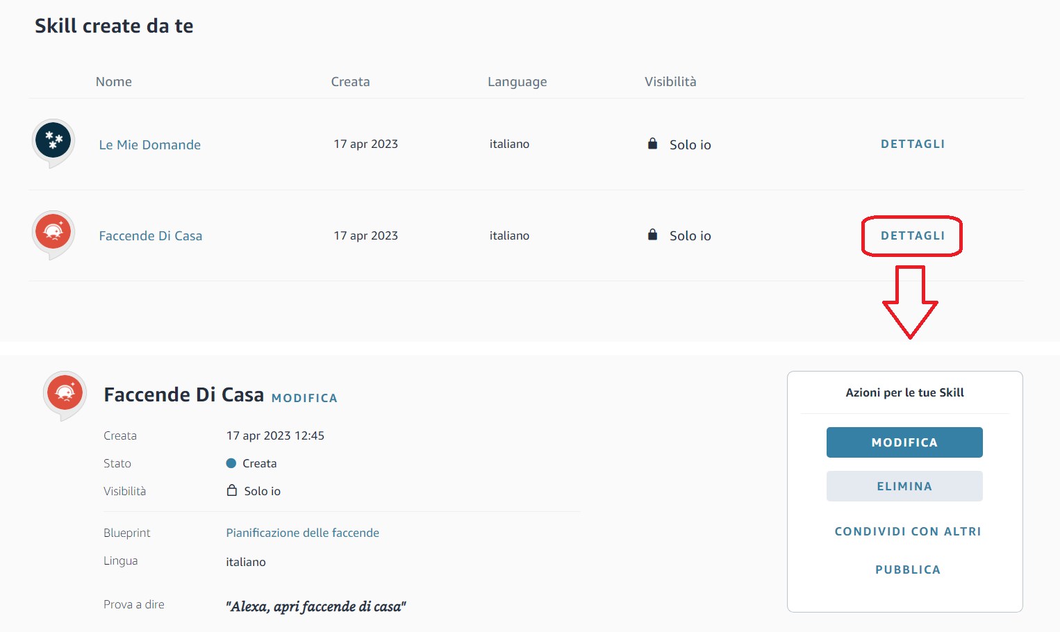 Le skill personalizzate sono elencate in questa pagina (sezione “Skill che hai creato”) con il pannello comandi (azioni) per eventuali modifiche, cancellazioni, condivisioni e pubblicazioni (vedi sotto).