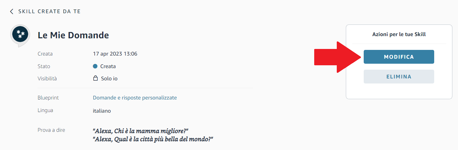 Tutte le skill che avete creato possono essere modificate in caso di necessità, per eliminare o aggiungere altri contenuti. Basta accedere alla home page di Blueprint Alexa, cliccare in alto su “Skill che hai creato”, selezionare la skill da modificare e cliccare su “Modifica”.