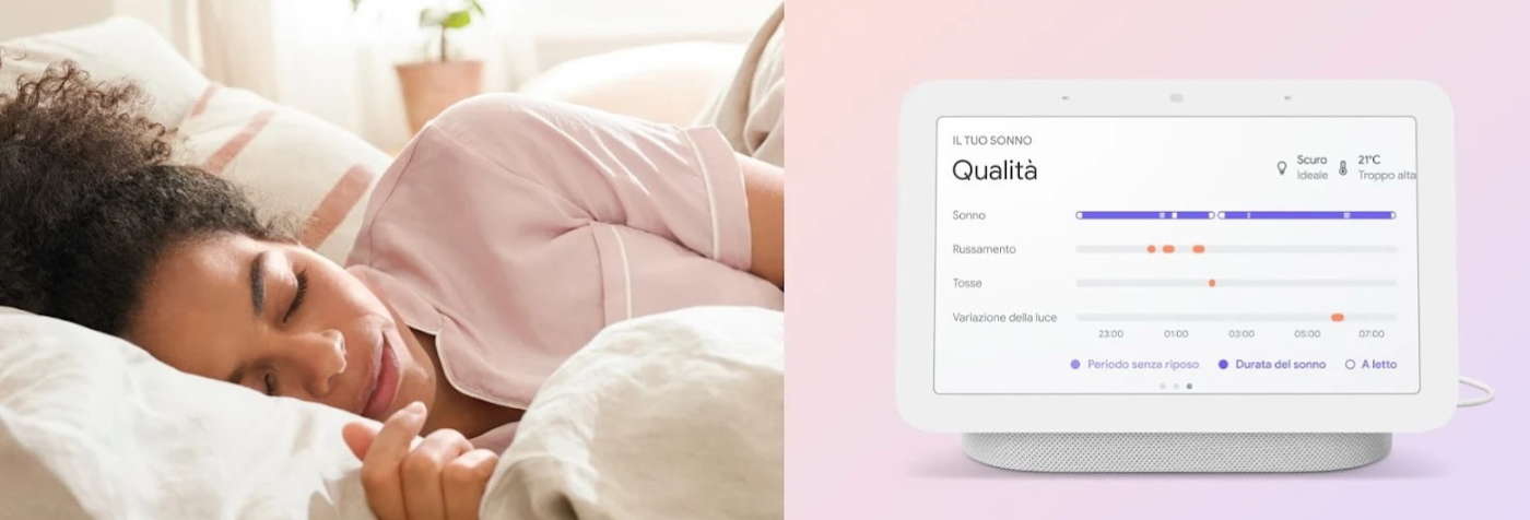 Al risveglio si può chiedere a Nest Hub un riepilogo del monitoraggio (“Hey Google, come ho dormito la notte scorsa?”) visualizzando la frequenza respiratoria, informazioni sui cambiamenti di illuminazione e temperatura nella stanza ma anche su eventuali disturbi come tosse e russamento. Fornisce anche consigli su come dormire in modo più regolare e sereno e può condividere tutti questi parametri con la app Google Fit.