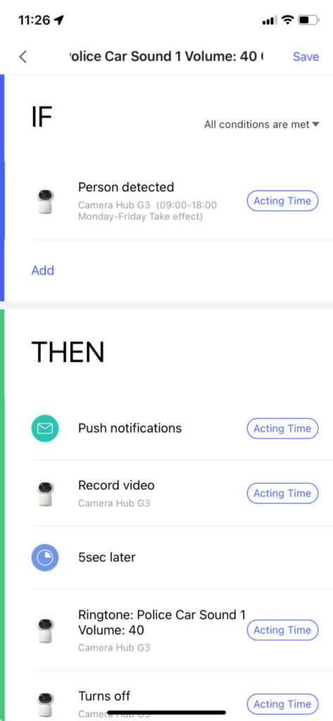 Le automazioni sono una funzionalità importante nell’ecosistema aperto di Aqara: l’app permette infatti di impostare delle sequenze composte da una o più condizioni legate anche a diversi sensori reali o virtuali, ad esempio il riconoscimento di un volto specifico o l’apertura di una finestra, e di eseguire conseguentemente una o più azioni, tutte contemporanee oppure dilazionate l’una dall’altra. Per preparare una buona automazione non servono competenze di programmazione in quanto il tutto è gestito da un’interfaccia che permette di collegare uno o più eventi scatenanti con una serie di azioni sequenziali eseguibili su tutti i prodotti collegati all’ecosistema di Aqara, compreso lo smartphone che può ricevere notifiche push anche nella loro forma “allarme”, ovvero quelle che vengono riprodotte ad alto volume anche quando si è impostato il telefono silenzioso. La Camera Hub G3 può anche riprodurre suoni dal suo altoparlante, a scelta fra le suonerie predefinite o registrazioni totalmente personalizzate. Lo speaker a bordo ha un volume non elevatissimo, buono per riprodurre avvisi e funzionare da interfono, senza essere quello di un antifurto.