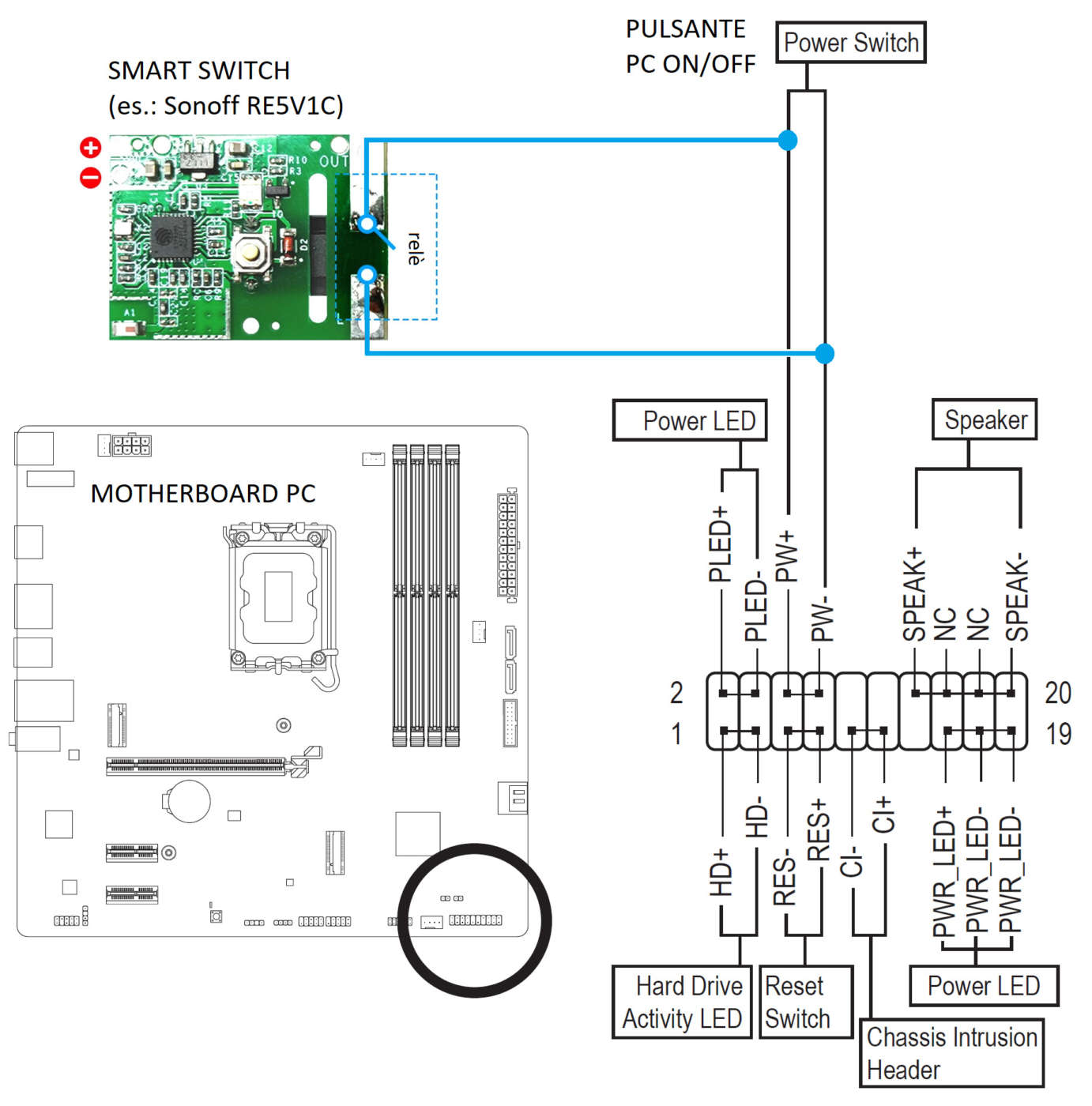 Lo smart switch Sonoff R5V1C è un piccolo circuito (34,5x25x19 mm) da inserire in un qualsiasi apparecchio elettrico ed elettronico da “smartizzare” come ad esempio il citofono oppure il PC. Richiede una tensione di 5Vcc (es.: alimentatore USB) ed è dotato di relè a contatto pulito per supportare correnti fino a 10A.