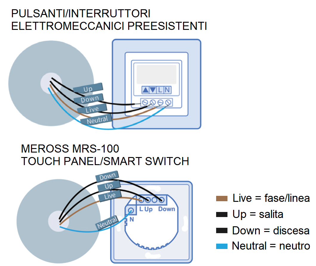 Tutti gli smart switch Meross si alimentano a 220Vca collegandoli sia alla fase (linea – cavo nero o marrone dell’impianto elettrico) sia al neutro (cavo blu). Fanno eccezione i modelli MSG100 e MSG200 per l’automazione delle serrande garage che richiedono una tensione di 5Vcc (1A) ricavabile da qualsiasi adattatore/caricabatteria USB.