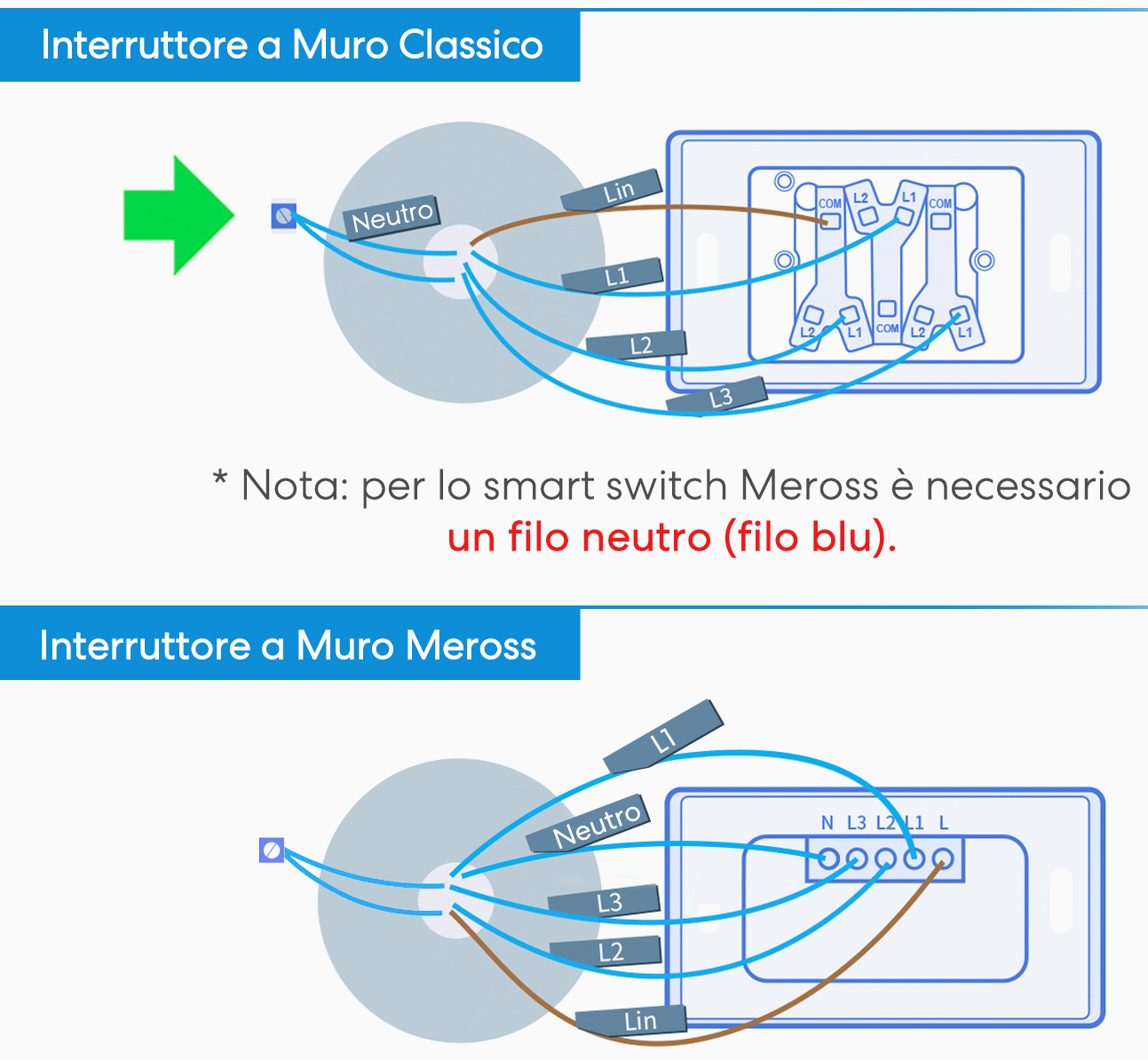 Il collegamento degli smart switch Meross (e non solo) richiede almeno la conoscenza delle nozioni base degli impianti elettrici civili (terra, fase, neutro, sezione cavi, ritorno, contatti puliti o sotto tensione, ecc.).