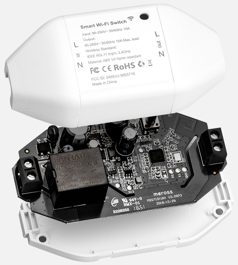 Smart switch entry-level della gamma Meross dotato di morsetti per il collegamento alla linea 220Vac (ingresso fase-neutro) e di una uscita per comandare qualsiasi dispositivo alimentato sempre a 220Vac con una potenza massima di 2300 watt (10 ampere).