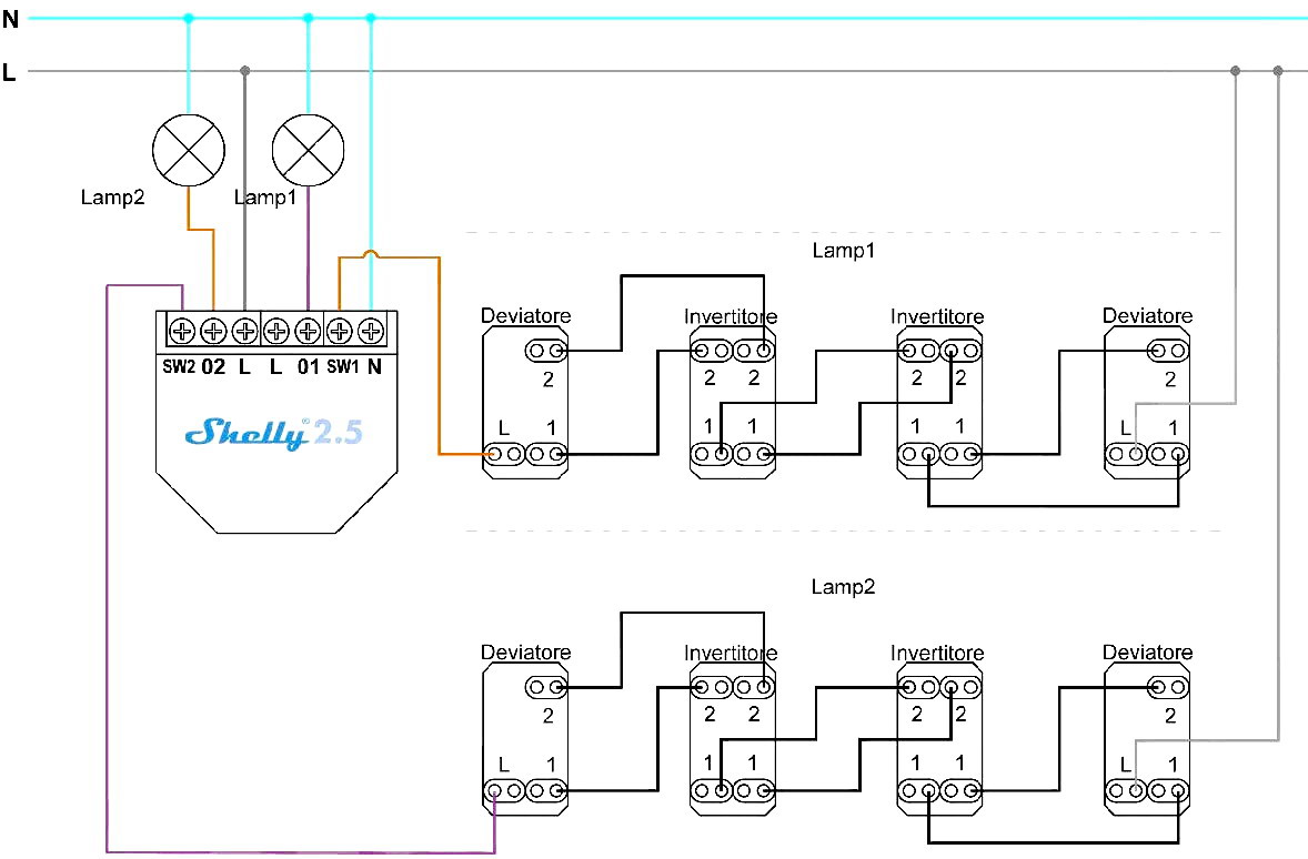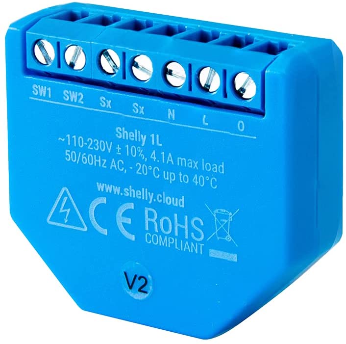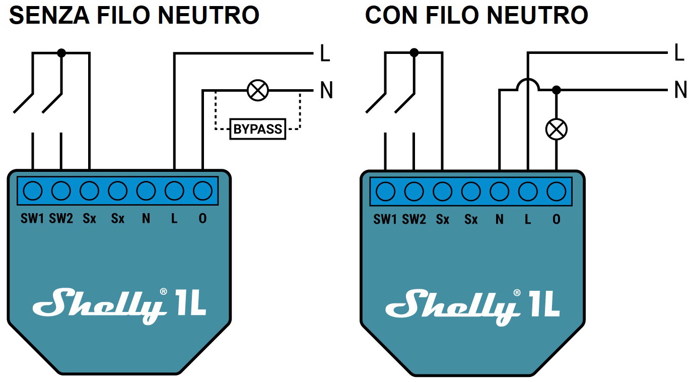 Shelly 1L è il primo smart switch al mondo che può controllare carichi resistivi (luci e resistenze elettriche), induttivi (luci a led, trasformatori, ventole, motori) e capacitivi (condensatori di avviamento motore, generatori e motori sincroni) anche senza collegamento del filo neutro.