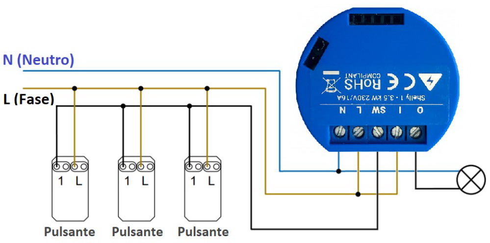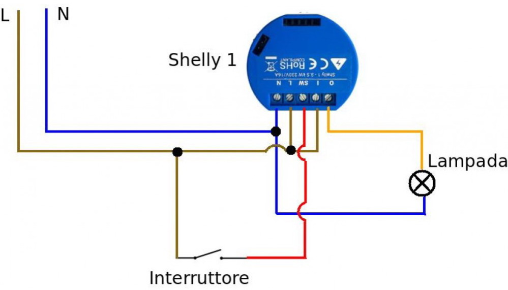 Si tratta di una grande comodità quando si vuole aggiungere il controllo smart ad un interruttore/deviatore preesistente, dove solitamente manca il cablaggio del neutro perché viene interrotta solo la fase, e senza bisogno di far passare un nuovo cavo dalla scatola di derivazione a quella che accoglie l’interruttore/deviatore ed anche lo Shelly 1L grazie alle sue dimensioni miniaturizzate.