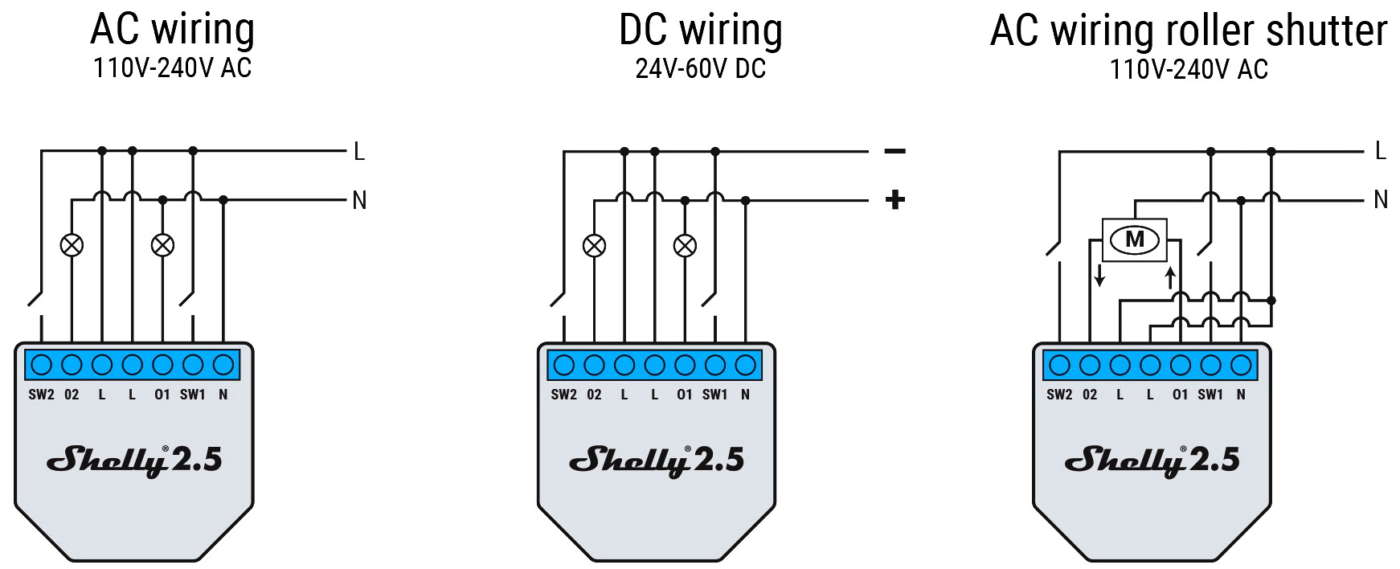 Anche lo Shelly 2.5 supporta la doppia alimentazione 220Vac/24-60Vcc per impianti indoor/outdoor, strip led, ecc. Da segnalare anche il sensore di sovraccarico e temperatura per disattivare automaticamente le uscite in caso di problemi. Manuali, documenti e schemi di applicazione sono disponibili qui.