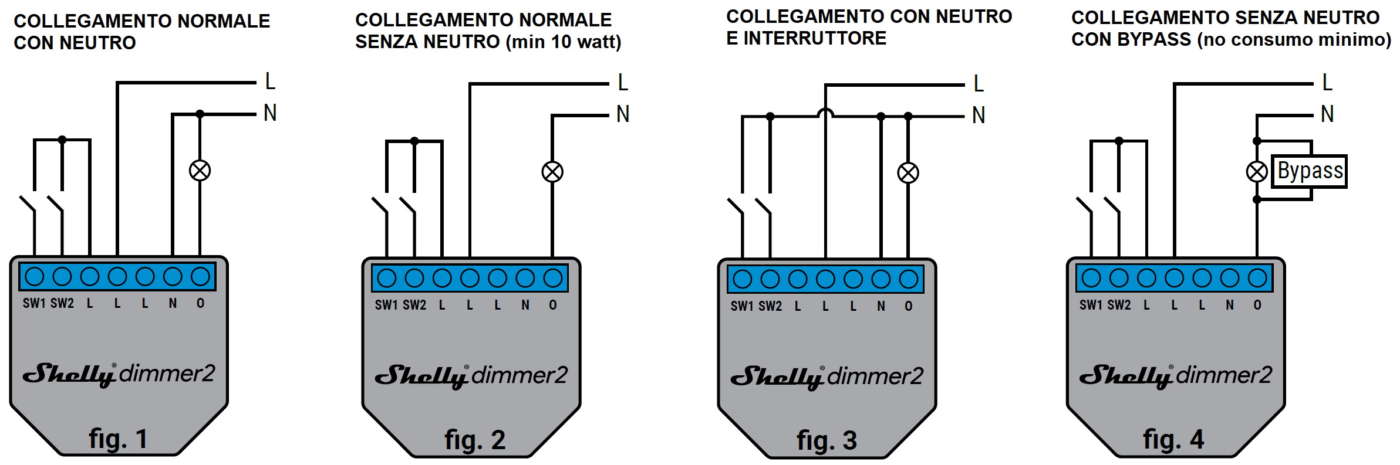 - Funzioni principali: interruttore/pulsante via app e voce (Alexa/Google), dimmer per lampade a incandescenza/alogene/led e trasformatori resistivi-induttivi, misurazione consumi elettrici, collegamento con/senza cablaggio neutro, timer, countdown, alba/tramonto, controllo via Wi-Fi Direct, LAN o cloud, scenari, condivisione con altri utenti, morsetti per collegamenti interruttori esterni