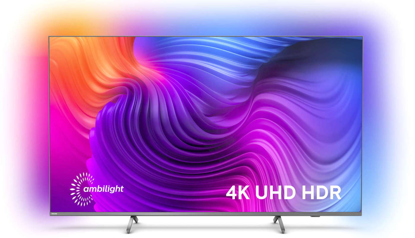 Il Tv Philips 75PUS8556 cattura l’attenzione non solo per la qualità delle immagini ma anche per il design (cornici e piedini ultraslim di colore argento brunito) e per la retroilluminazione Ambilight che genera su tre lati dello schermo una luce RGB dinamica, sincronizzata con i colori delle immagini e adattabile anche ai giochi e al colore della parete.