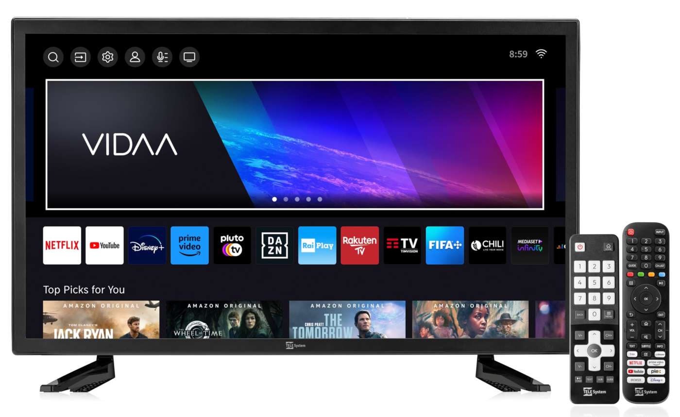 Smart TV ultra-compatto (solo 44,3×31 cm) ideale per cucine e mezzi mobili come camper e caravan grazie alla doppia alimentazione (220Vca e 12Vcc).