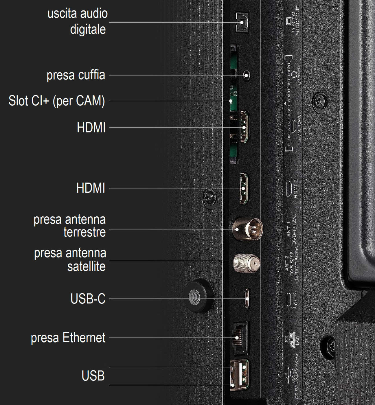 Include il doppio sintonizzatore terrestre e satellitare (DVB-T/T2/S/S2, MPEG-2, MPEG-4 e HEVC Main 10) compatibile con modulo CAM CI+ HD (opzionale) per i canali criptati (es.: tivùsat).