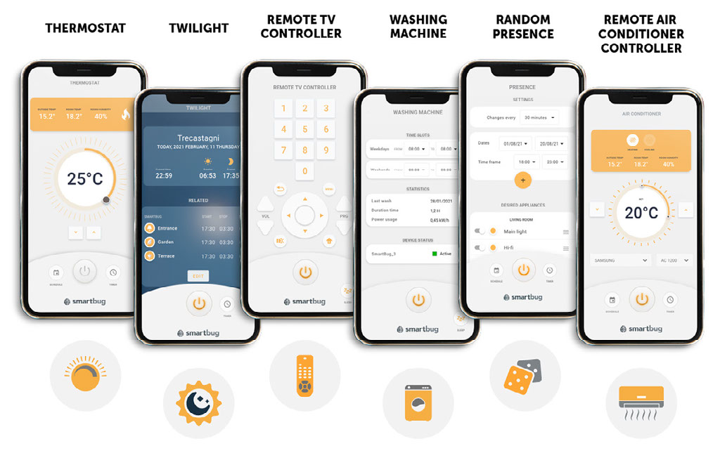 Con SmartBug l’utente può controllare la tecnologia più tradizionale attraverso un’app intelligente scaricabile sullo smartphone dove memorizza tutti i codici, aggiungendo infinite potenzialità. Mentre un sensore di temperatura e umidità consente il controllo di ogni ambiente e dell’HVAC. Può interfacciarsi con le stazioni meteo sul web e prepararsi per le esigenze domestiche anche in outdoor.