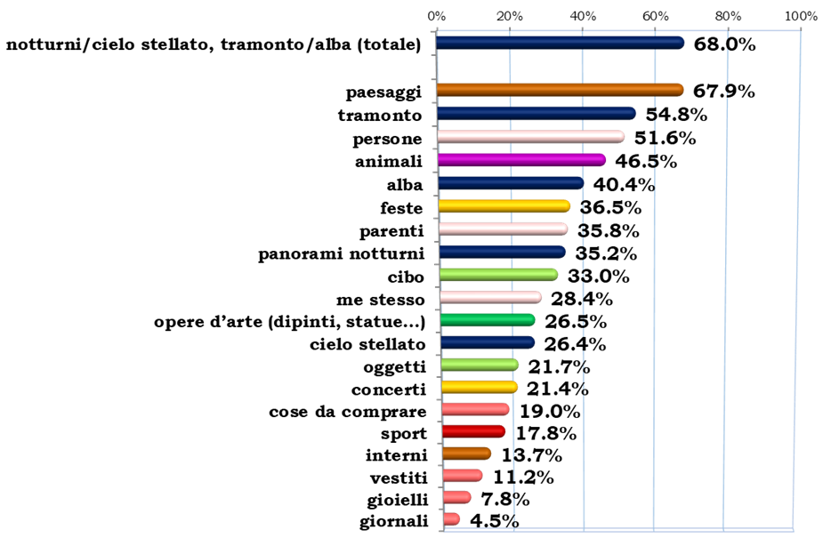 Fuori dal podio troviamo gli animali (46.5%: insomma più cani e gatti che se stessi) mentre i panorami notturni (35.2%) e il cielo stellato (26.4%) superano gli oggetti in generale, quelli dello shopping, i vestiti, etc. Complessivamente le fotografie a situazioni tra il tramonto e l’alba sono amate dal 68.0% del campione (ma le donne 15-24enni ‘salgono’ all’81%).