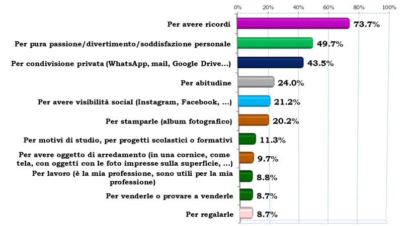 La fotografia da smartphone è solo in piccola parte esibizionismo: tra i motivi per fotografare con il device la visibilità social è solo al quinto posto (21.2% – sale ma solo al 30% presso i 15-24enni) superata persino dalla semplice abitudine (24.0%), ma soprattutto dal desiderio di conservare ricordi (73.7% – per le donne 79%), dalla passione personale, dalla soddisfazione che il fotografare sa dare (49.7% – dato simile per genere e fascia di età differenti) e dalla condivisione privata (ad esempio WhatsApp o via e-mail: 43.5%).