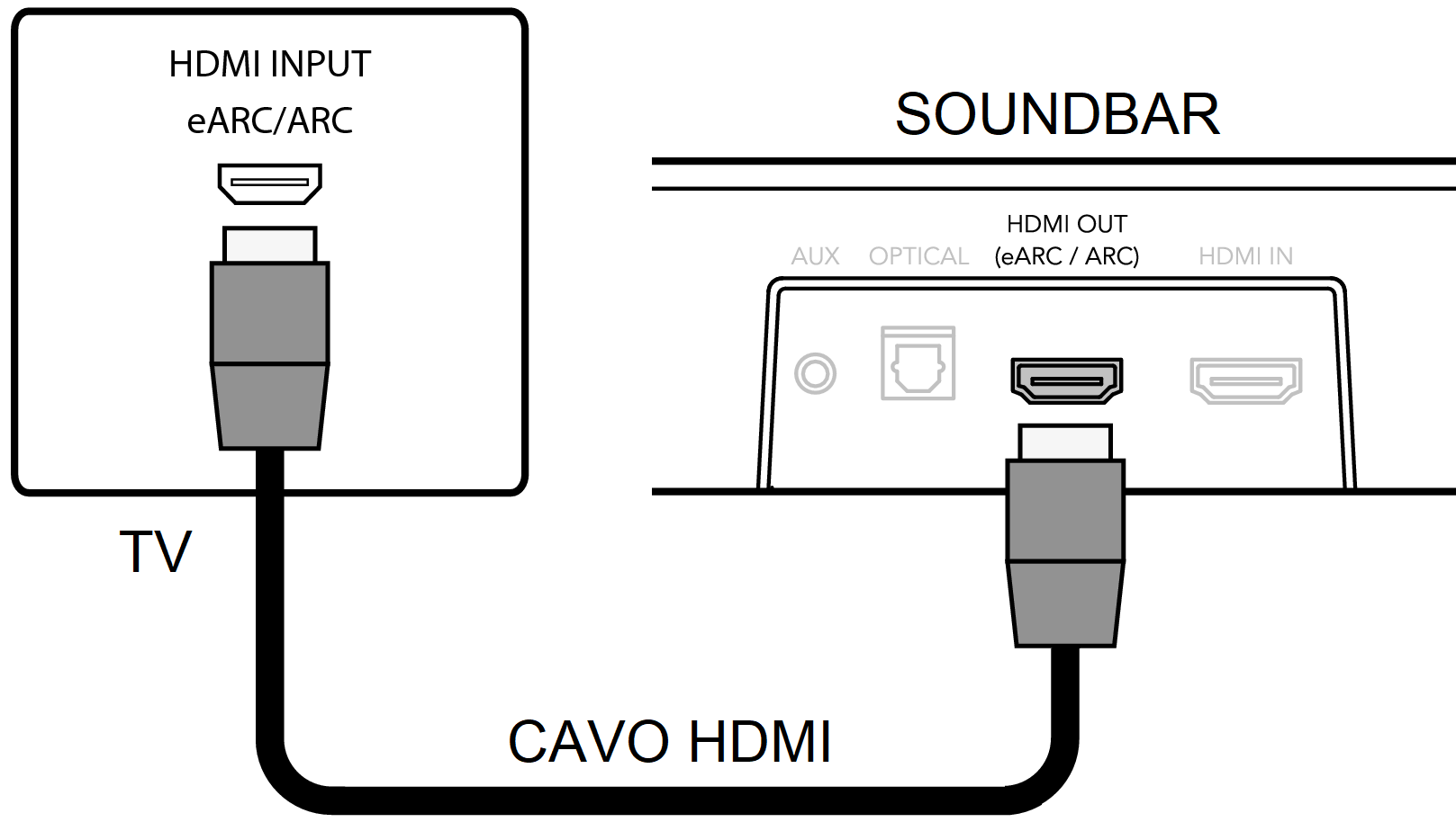 La procedura di installazione della soundbar è un lavoro semplice e veloce. Dopo averla posizionata sotto il TV o fissata a parete dovete semplicemente procurarvi un cavo HDMI oppure ottico S/PDIF Toslink, spesso forniti con la soundbar, e collegarlo tra la soundbar (porta HDMI OUT oppure OPTICAL) ed il televisore (HDMI 1-2-3-4 o OPTICAL OUT – S/PDIF).