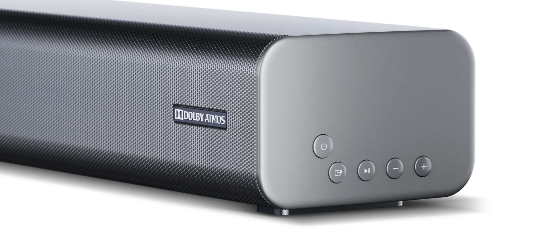 Soundbar dal design morbido ed elegante, dotata di display a led frontale (ingresso, modalità audio, ecc.) celato dietro la griglia, pannello comandi laterale e telecomando.