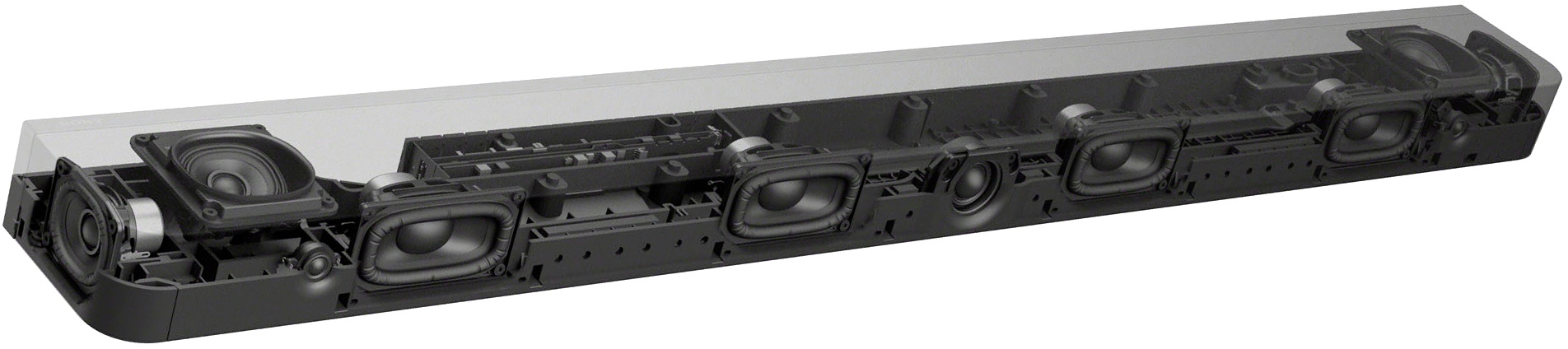 Il pannello frontale ospita 4 altoparlanti mid-woofer (canali destro, centrale e sinistro) per un suono ampio e dettagliato (anche nella riproduzione dei dialoghi) e il condotto bass-reflex per esaltare i toni bassi. Il subwoofer è esterno (wireless) con altoparlante da 165 mm per una potenza totale di picco di 440 watt.