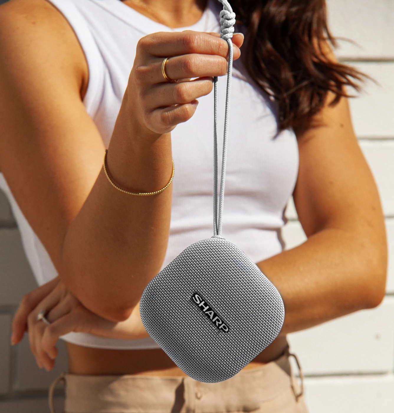 Speaker portatile quasi tascabile con design giovane e dinamico grazie al laccetto integrato e al rivestimento in tessuto (disponibile in vari colori) con inserti in gomma siliconica antiscivolo.