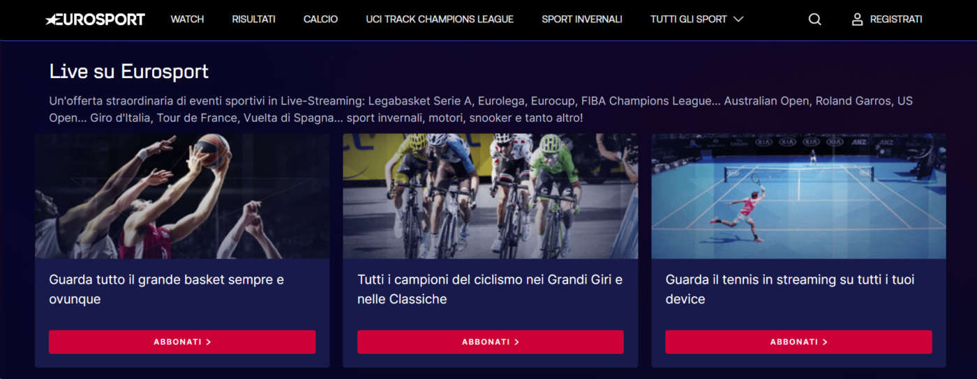 Propone sia i canali Eurosport 1 e 2 (live streaming) sia la copertura live e on demand di centinaia di tornei ed eventi di spicco di basket, tennis, ciclismo, sci alpino, biathlon, calcio, Superbike e Formula E come Legabasket Serie A, Eurolega, Eurocup, FIBA Champions League, Australian Open, Roland Garros, US Open, Giro d’Italia, Tour de France, Vuelta di Spagna e molto altro.