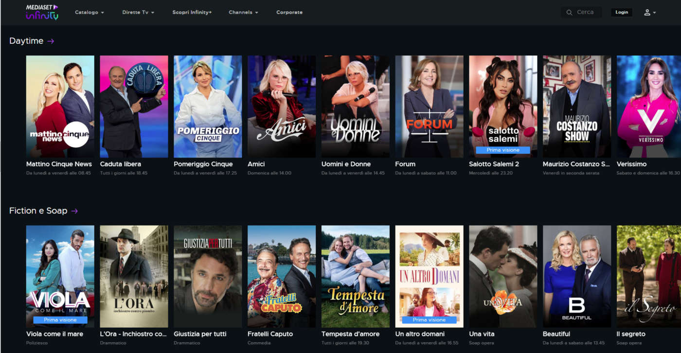 Il catalogo gratuito comprende centinaia di fiction e serie Tv (Chicago Fire 3, Hamburg distretto 21, NCIS, Dr. House, All Rise 2, ecc.), soap e telenovelas (Viola come il mare, Una Vita, Tempesta d’Amore, ecc.), film già andati in onda sulle reti televisive Mediaset e inediti.