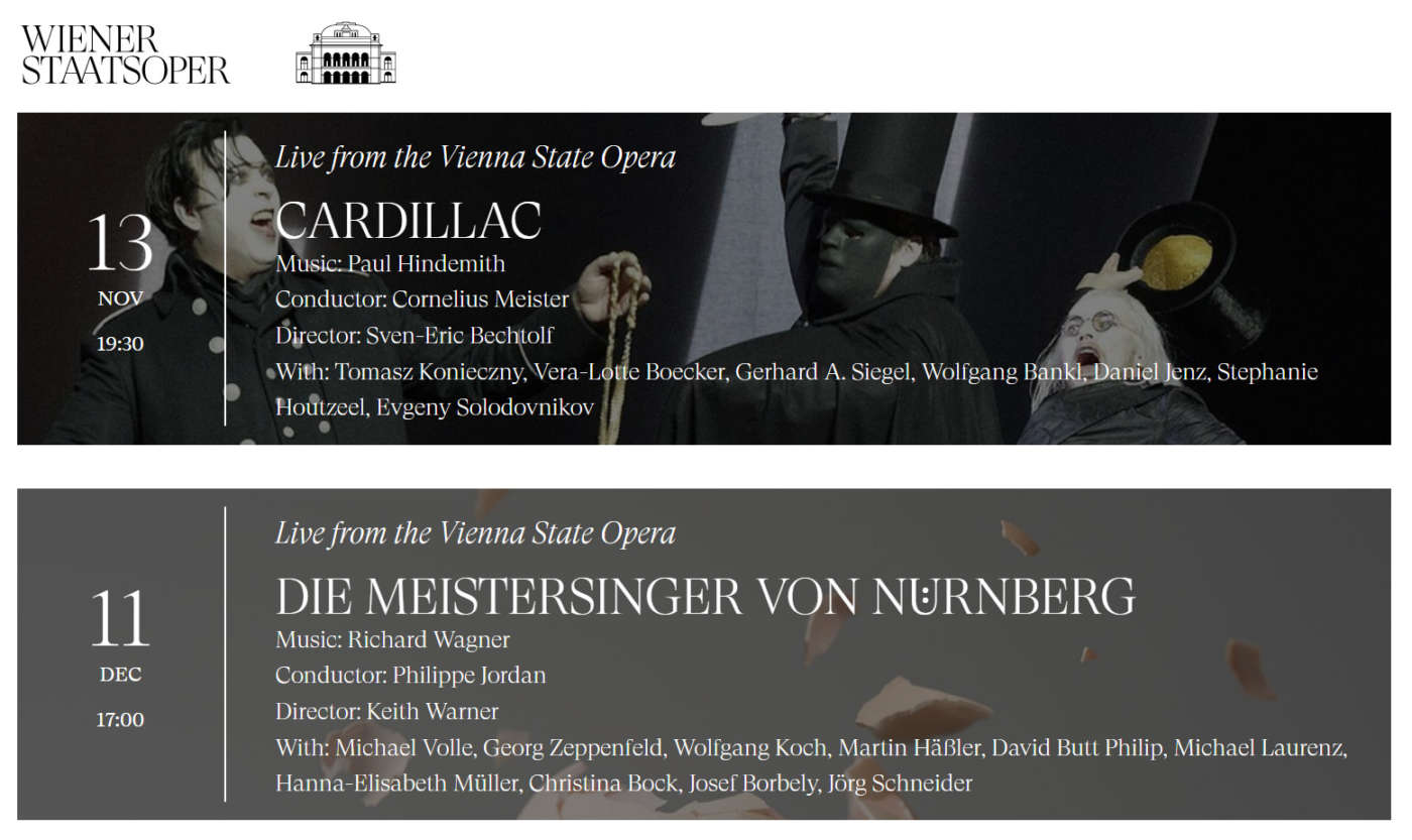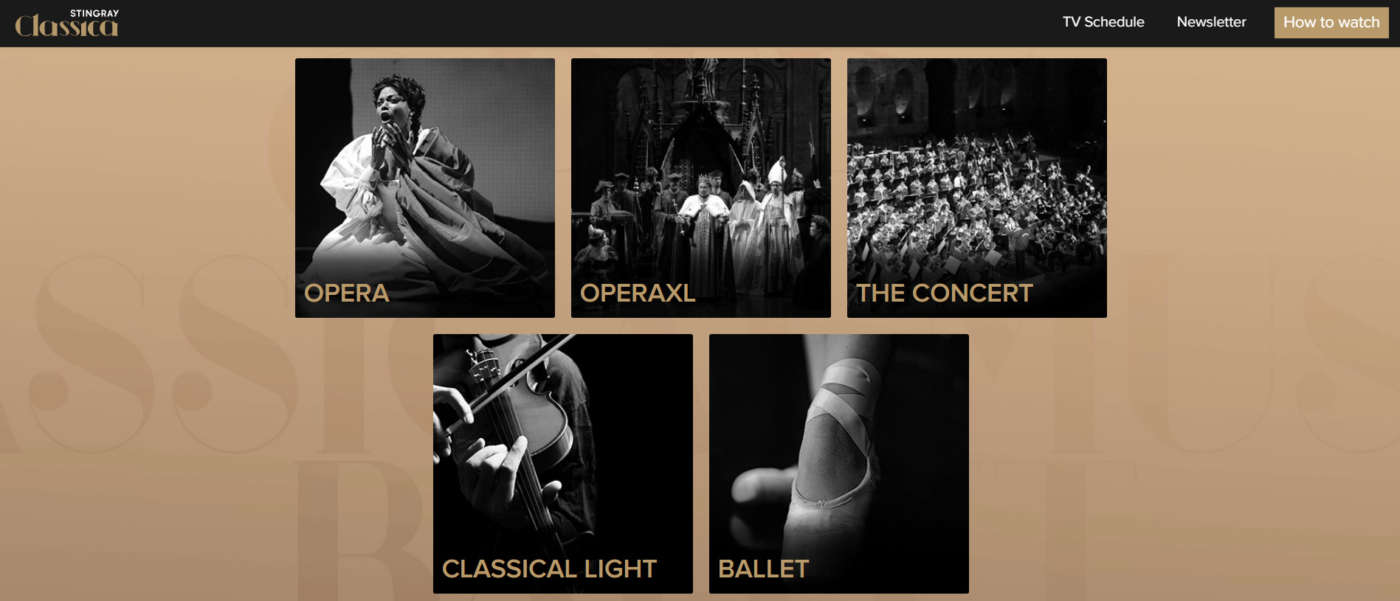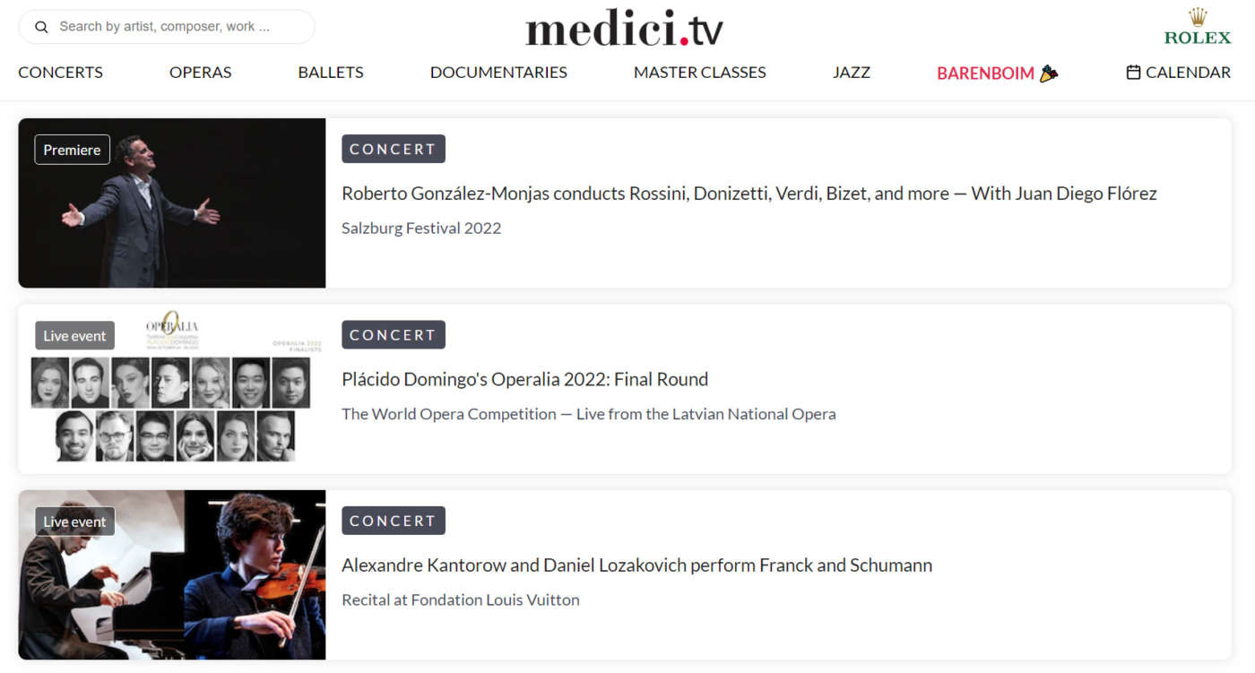 Agli appassionati di musica classica (sinfonica, da camera, sacra e lirica) consigliamo i portali Stingray Classica, Medici.tv, Opera di Stato di Vienna e Berliner Philarmoniker che trasmettono, sia in live streaming che on demand, migliaia di concerti, opere, balletti, documentari, programmi educativi e di approfondimento.
