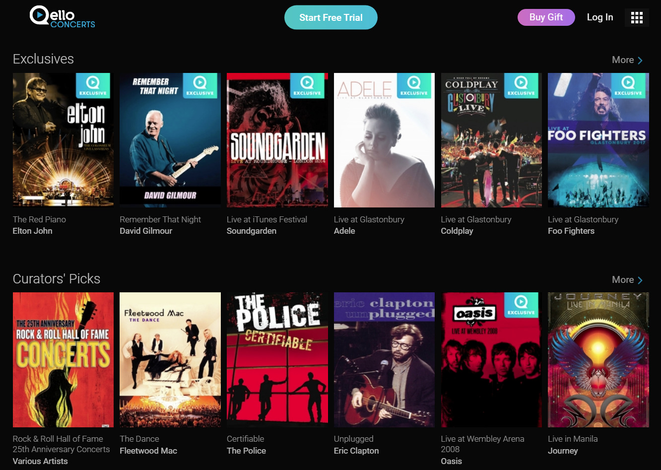 Qello Concerts è la piattaforma di streaming musicale del gruppo canadese Stingray Digital che spazia dal rock classico a quello progressivo, dal blues al pop, dal country al metal, dal folk al jazz senza trascurare altri generi come EDM, Indie, Christian & Gospel.