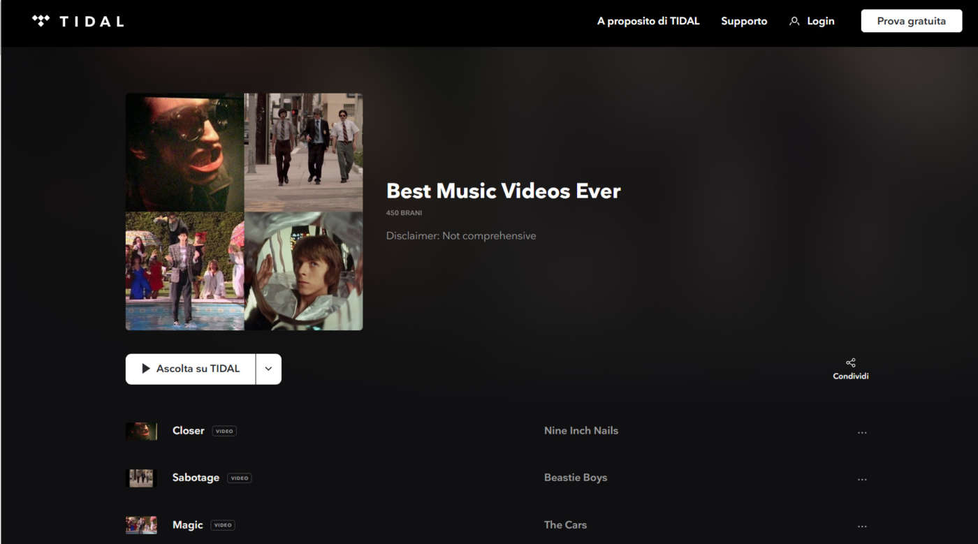 Tidal è un servizio audio e video musicale senza pubblicità con un’elevata qualità audio (anche non compresso MQA, Dolby Atmos, Sony 360 Reality Audio e Hi-Fi fino a 9,216 Mbps) e video (HD).