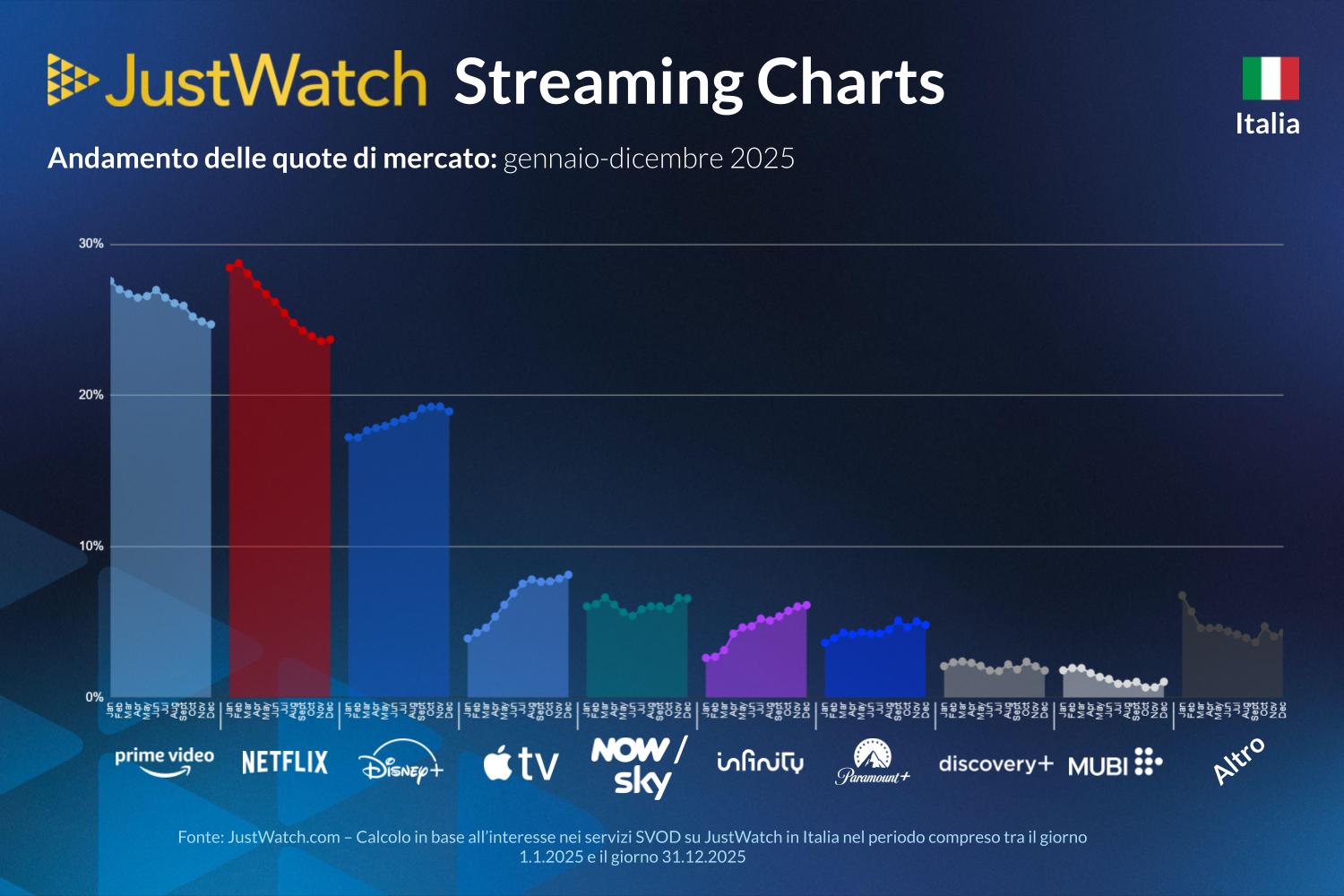 Secondo i dati diffusi da JustWatch, nel quarto trimestre 2025 il mercato dello streaming in Italia si conferma altamente competitivo, con distacchi minimi tra i principali operatori e dinamiche in costante evoluzione. Le Streaming Chart, basate sull’interesse reale degli utenti, fotografano un settore ormai maturo, in cui anche variazioni di un solo punto percentuale assumono un peso strategico rilevante.