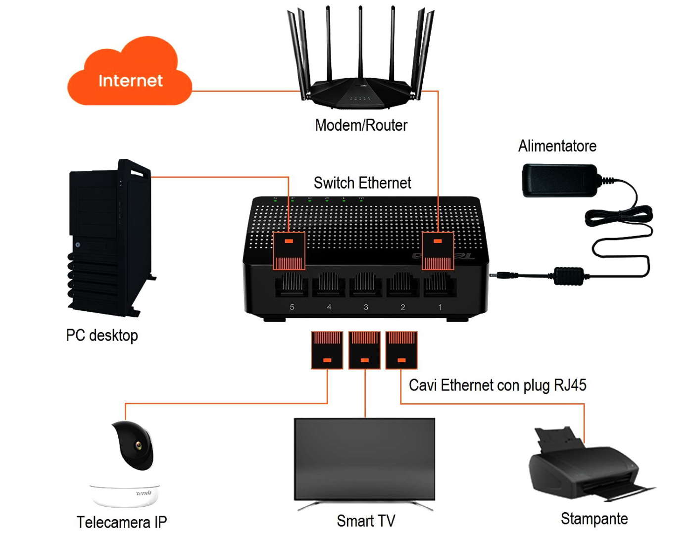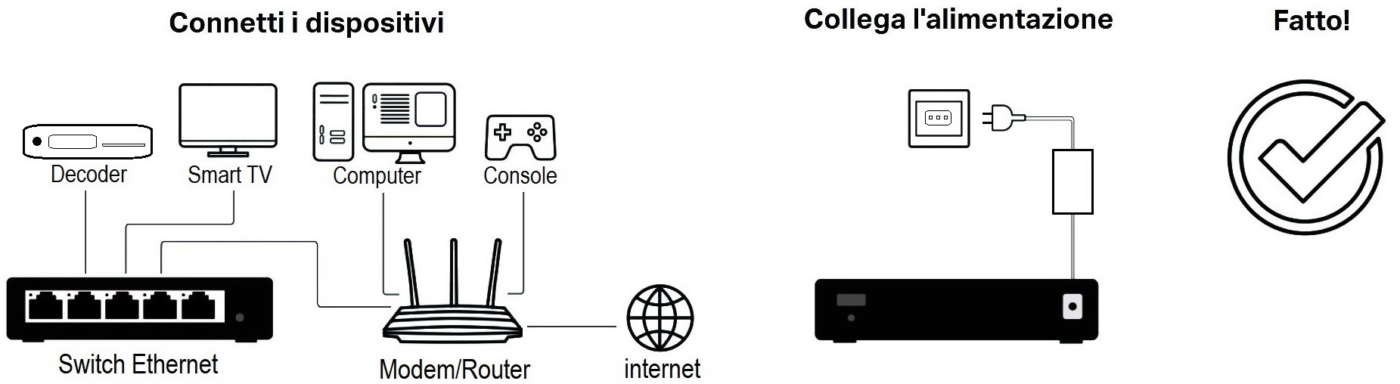 Si collega al modem/router con un cavo di rete a doppini twistati (Cat.5e, 6, 7, ecc.) e mette a disposizione 4, 7 o più prese RJ45 (Base-T) per collegare qualsiasi dispositivo con interfaccia Ethernet come Tv, decoder, soundbar, PC, stampante, console videogiochi, centralina antifurto, telecamera di sorveglianza, ecc.