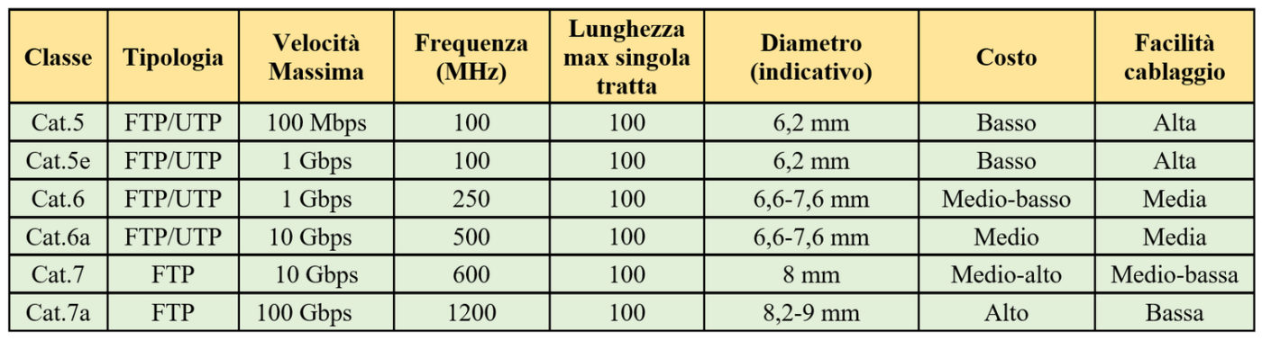 Per sfruttare le potenzialità di una porta Ethernet GbE (da 1 a 10 Gbps) sono necessari cavi Cat.5e o più avanzati (Cat.6, 6a, 7, 7a) perché il “vecchio” Cat.5 arriva solo a 100 Mbps (Megabit). La lunghezza massima per singola tratta è di 100 metri, più che sufficienti anche per una o più dorsali domestiche o derivazioni verso giardini o fabbricati esterni (dépandance, garage, magazzino, ecc.).