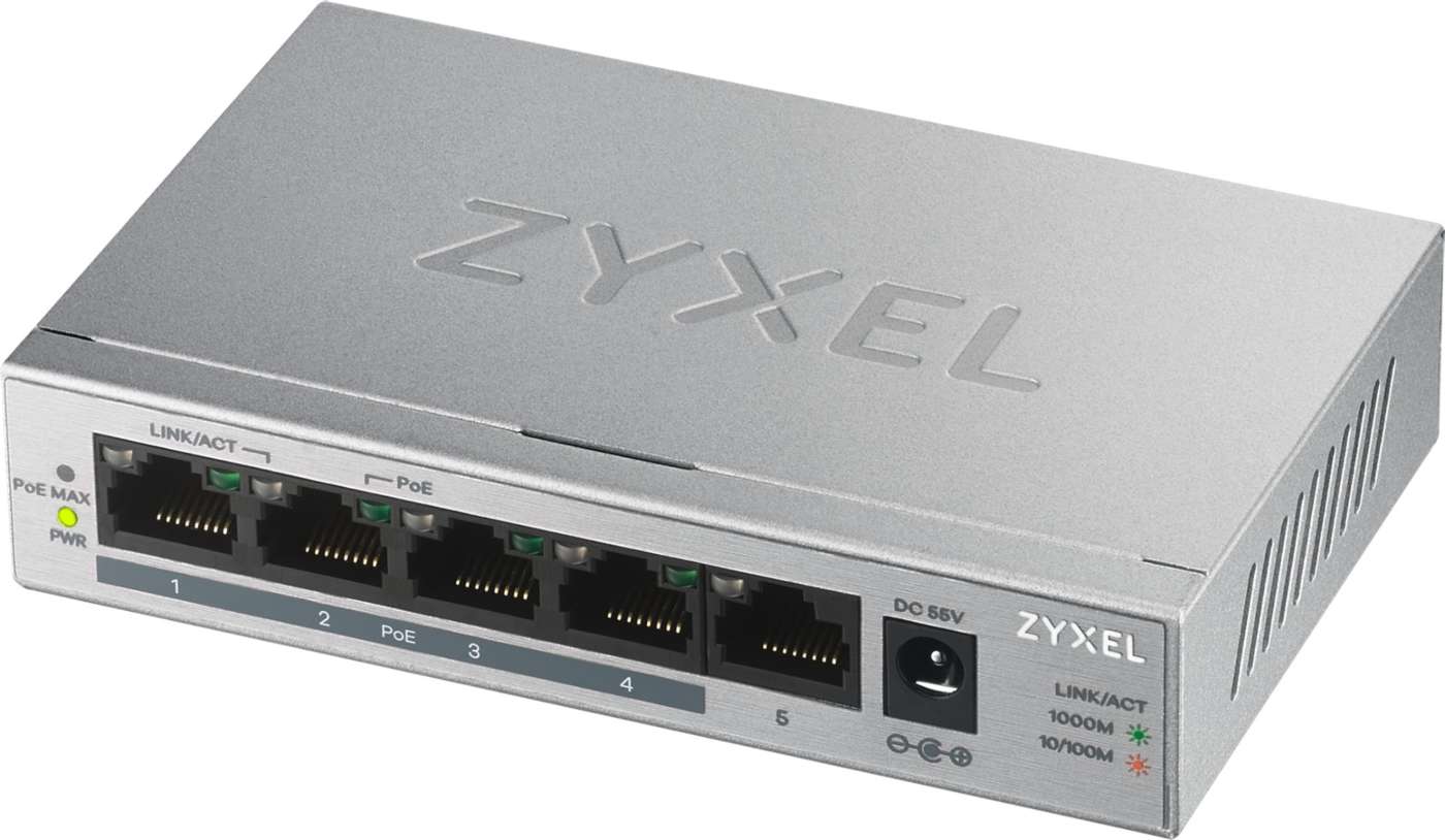 Zyxel GS1005HP è uno switch semi-professionale in metallo con 5 porte Gigabit di cui 4 con supporto PoE+ (alimentazione via Ethernet – 802.3af/at) per un massimo di 60 watt totali.