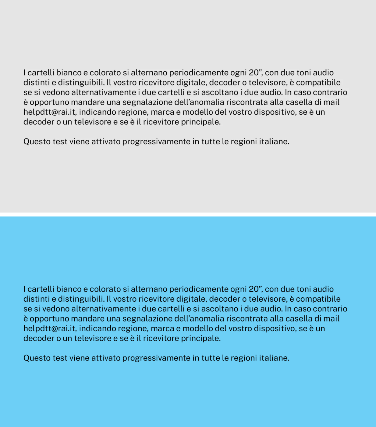 Il caso di problemi di ricezione del segnale test Rai è possibile scrivere a helpdtt@rai.it indicando marca e modello del decoder e/o Tv, se si tratta del primo o secondo apparecchio, ecc. È possibile anche verificare sul sito web del produttore o distributore dell’apparecchio se è disponibile un aggiornamento del software.