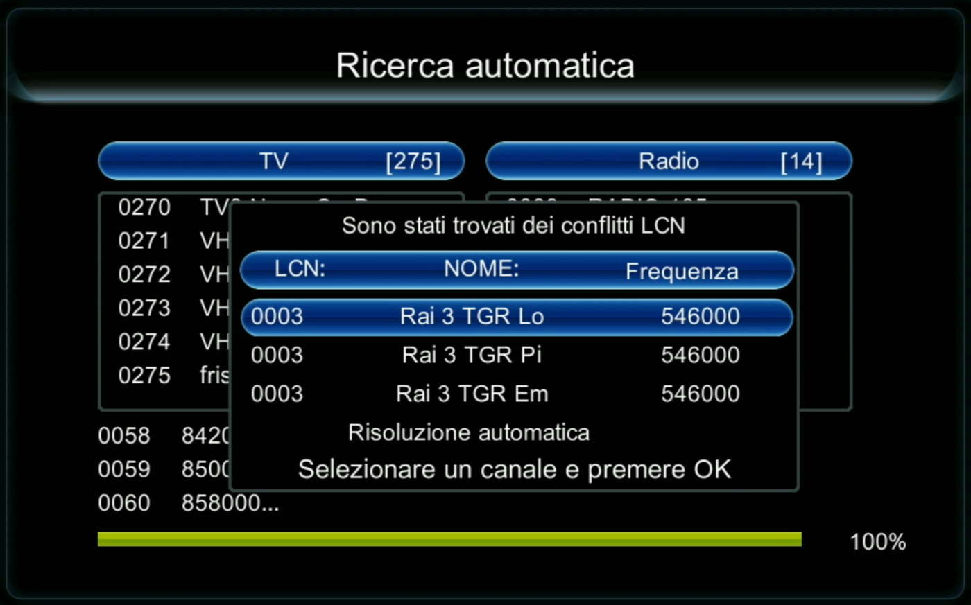 Se ciò accadesse bisogna ripetere la sintonizzazione ed essere pronti a scegliere manualmente il canale desiderato al termine della procedura oppure disabilitare l’ordinamento LCN (sconsigliato) e riposizionare manualmente il canale desiderato.