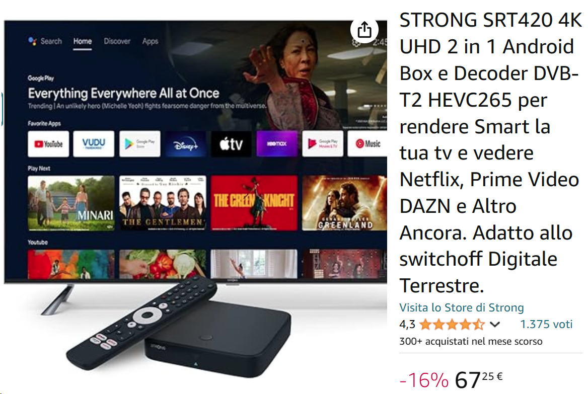 I box Android TV con sintonizzatore T2 HEVC sono un po’ più cari, indicativamente tra i 60 e i 90 euro, ma offrono molte più funzioni (vedi sopra) e supportano anche il 4K.