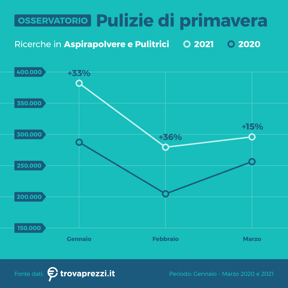 Nei primi tre mesi del 2021 è emerso un reale interesse per la categoria Aspirapolvere e Pulitrici: a gennaio 2021 le ricerche sono state oltre 380mila, con una crescita del 33% rispetto a gennaio 2020. Il trend si è mantenuto in linea durante febbraio (circa 280mila ricerche) con una percentuale di crescita del +36% rispetto allo stesso periodo dell’anno precedente, mentre per il mese di marzo 2021 la crescita anno su anno si è fermata al 15% (seppur con circa 300mila ricerche).
