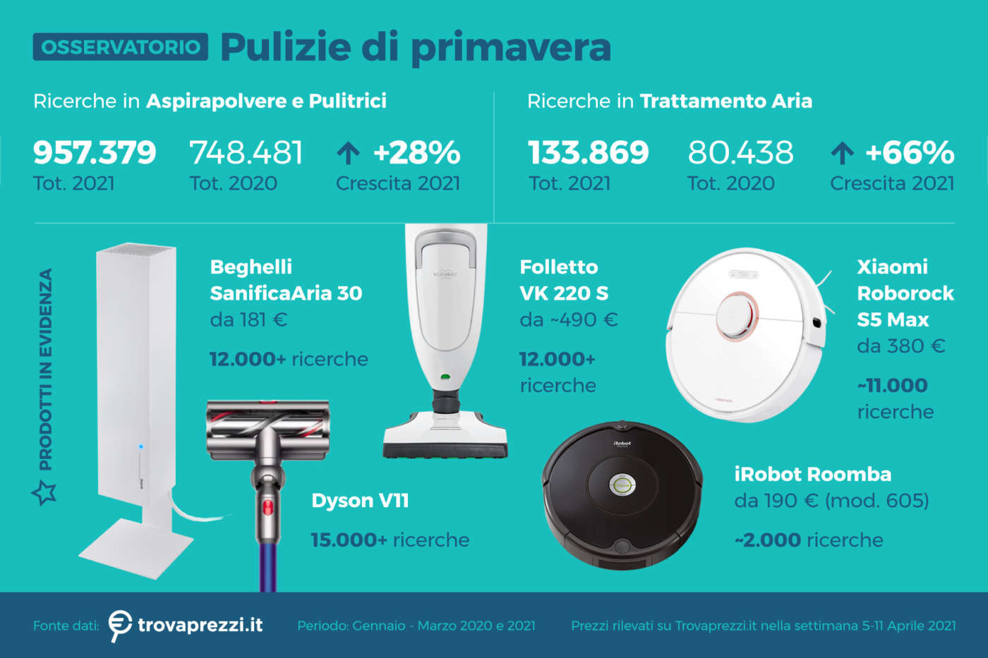 Su Trovaprezzi.it aumentano le ricerche di robot ed elettrodomestici per le pulizie (+28% 1° trimestre 2021 su 1° trimestre 2020) e di dispositivi per il trattamento dell’aria (+66% 1° trimestre 2021 su 1° trimestre 2020)