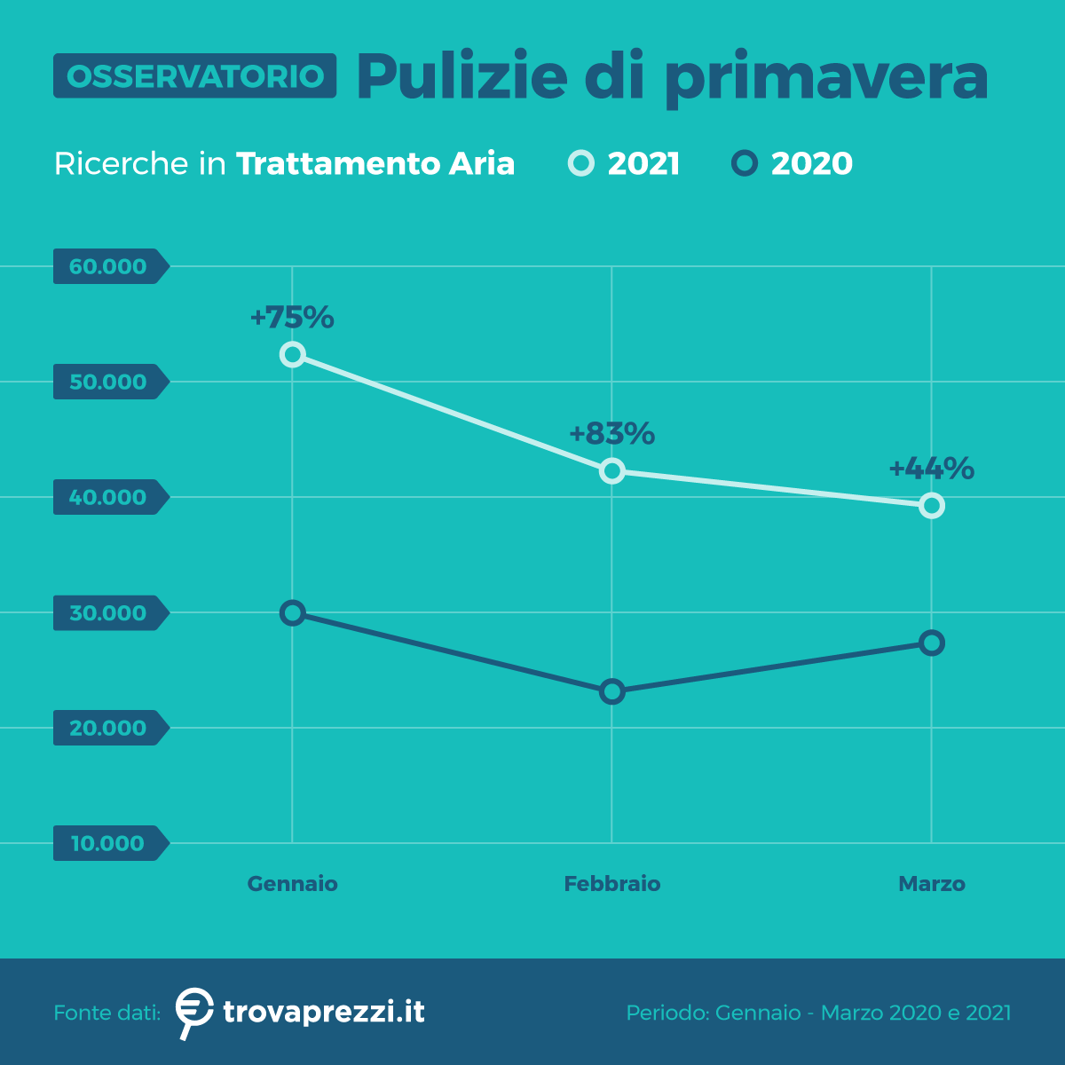 Una delle categorie che ha maggiormente beneficiato degli effetti della pandemia è stata Trattamento Aria, che include tutti i dispositivi utili alla ventilazione e alla depurazione dell’aria. L’esigenza di migliorare la salute e la qualità della vita a partire dagli ambienti domestici ha spinto molti italiani all’acquisto e all’installazione di impianti di ventilazione in casa che potessero assicurare un corretto ricambio d’aria nei locali chiusi. Si tratta di una categoria che in passato ha goduto di minore interesse su Trovaprezzi.it e che oggi, invece, ha visto crescere notevolmente le ricerche degli utenti. Nella settimana 10-16 febbraio 2020 si registravano 3mila ricerche ma già nelle settimane successive, nella prima fase di lockdown, si è evidenziata una crescita notevole rispetto alla settimana di riferimento (+65% tra il 16 e il 22 marzo 2020 e + 105% tra il 13 e il 19 aprile 2020). Nel primo trimestre del 2021 le ricerche sono ulteriormente aumentate: oltre 52mila nel mese di gennaio (+75% rispetto allo stesso periodo dell’anno precedente), oltre 42mila a febbraio (+83% rispetto al febbraio 2020) e circa 40mila a marzo (+44% rispetto al marzo dell’anno scorso).