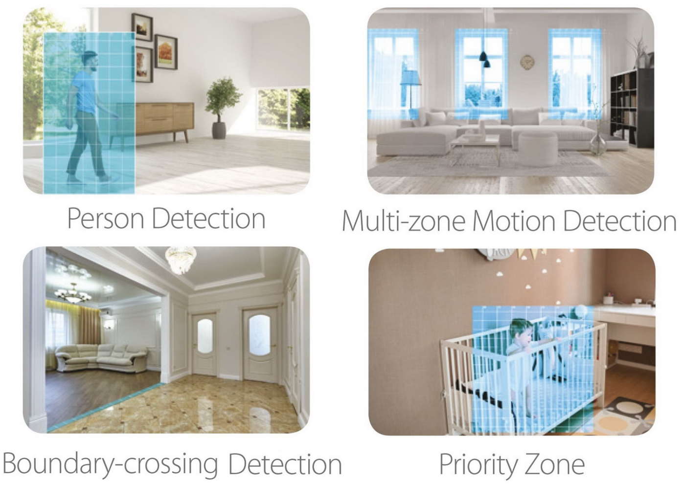 Permettono di distinguere una figura umana da tutto il resto, inviare le notifiche solo se il movimento avviene in aree specifiche della stanza (es.: porte e finestre, lettino del bambino, ecc.) o se un intruso attraversa una linea virtuale tracciata sul display touch dello smartphone.
