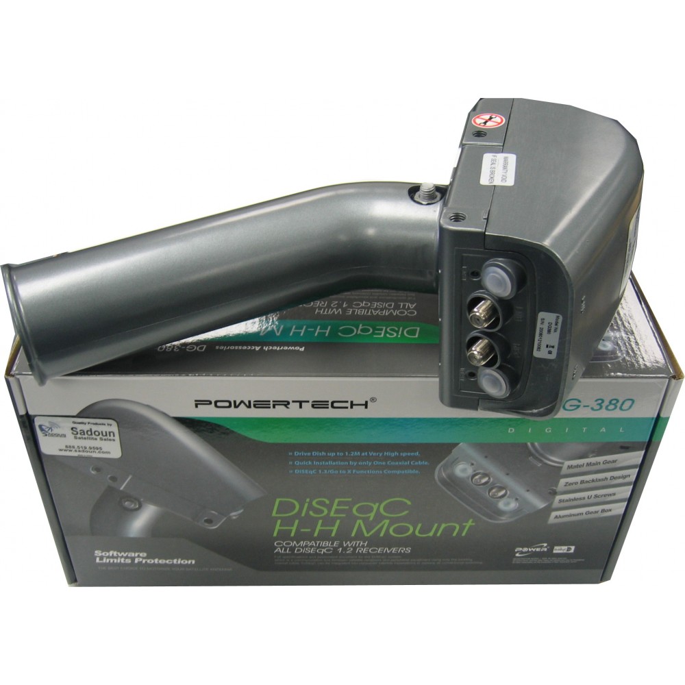 Realizzato quasi interamente in metallo (compresi gli ingranaggi interni), il DG380 è può orientare le parabole fino a 120 cm tramite i protocolli DiSEqC 1.2 e USALS. Assicura la massima precisione nel puntamento dell’antenna (risoluzione di 0,1°), copre un arco di 160°, è silenzioso e dotato di 2 pulsanti e 2 led per la rotazione manuale est-ovest.