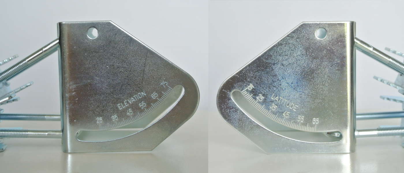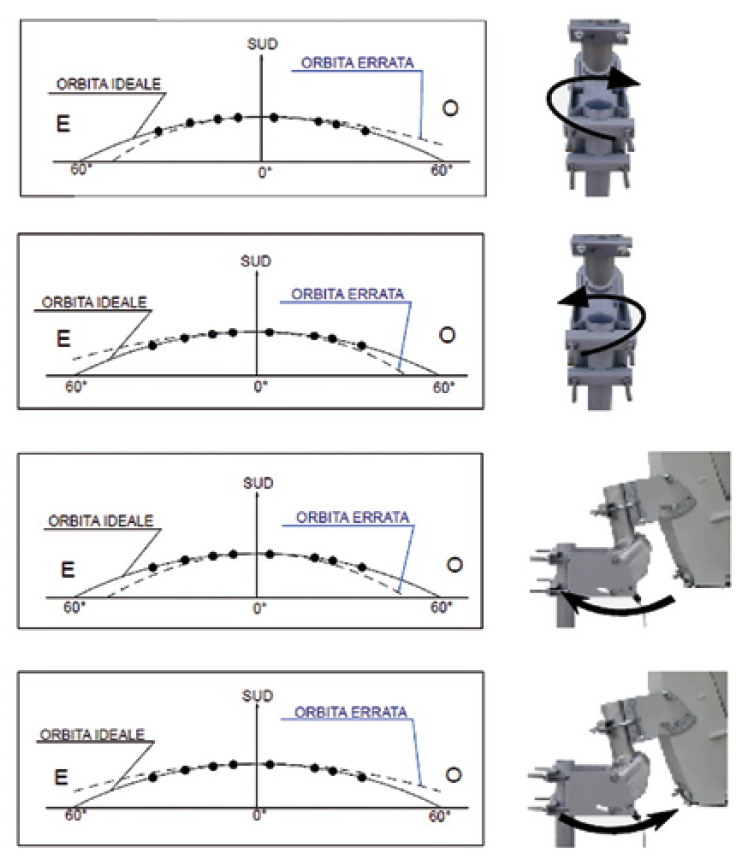 La fase successiva, quella più delicata, riguarda l’allineamento del motore e della parabola rispetto al piano orizzontale (azimut) e verticale (elevazione). Per l’azimut si deve ruotare il palo del motore insieme all’antenna verso il sud polare con l’ausilio di una bussola o delle app per iOS/Android (es.: Dishpointer). Per l’elevazione si utilizza la scala graduata ricavata sul fianco della staffa di sostegno oppure un inclinometro fino ad ottenere lo stesso angolo riportato nella tabella spesso riportata nel manuale d’uso e correlato alla latitudine del luogo di installazione (es.: 45° per Milano, 48°-48,5° per Roma, 52° per Palermo).