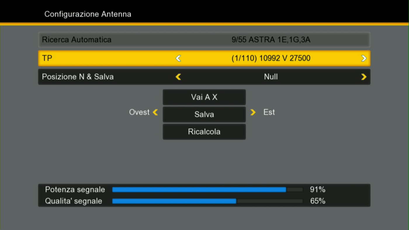 Completato l’allineamento, si passa al controllo del segnale (livello e qualità) da tutti i satelliti visibili con la parabola. Per questa operazione si consiglia di collegare un misuratore di campo (con display LCD) direttamente all’LNB o alla presa REC/RECEIVER/DECODER del motore. Se non si dispone di uno strumento, bisogna verificare il corretto puntamento dei satelliti direttamente sul decoder, non prima però di aver verificato a vista il corretto (e sicuro) movimento dell’antenna con i pulsanti di movimento EST e OVEST.