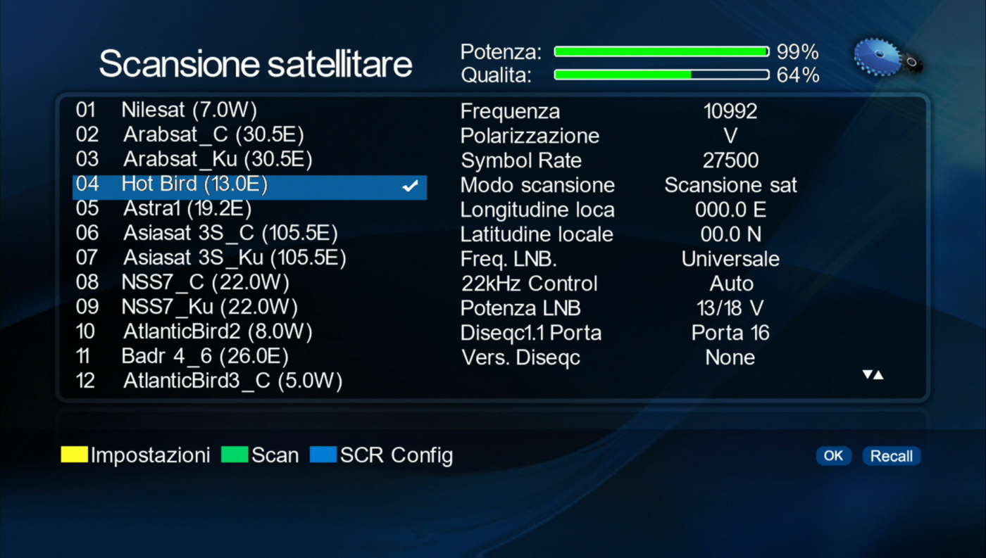 Negli impianti più moderni di tipo SCR e dCSS basta cambiare la voce “Freq. LNB” (SCR A/B – canale IF 1…16) oppure premere il tasto blu (SCR Config), scegliere tra SCR e dCSS, la user band (1…4/1…16) ed eventualmente la sua frequenza centrale se si preferisce non utilizzare la canalizzazione standard adottata anche da Sky. Completata la configurazione dell’impianto, superflua per chi possiede una tradizionale parabola monofeed con LNB universale puntata su Hotbird, si può procedere con la ricerca dei canali scegliendo tra le varie opzioni a disposizione: oltre alla Blind Scan già citata, troviamo la scansione dedicata alle frequenze di tivùsat (TivùSat Scan) con possibilità di mantenere o eliminare la precedente lista canali, la Scansione Sat di tutte le frequenze di un singolo satellite riportate nella lista transponder, la Scansione TP riservata al solo transponder evidenziato nella schermata. La lista transponder è modificabile a piacimento dal sottomenu “Lista satelliti” (Satellite > OK > tasti colorati per cancellare, modificare o aggiungere una frequenza) e si può anche aggiornare ogni volta che si utilizza la Blind Scan.