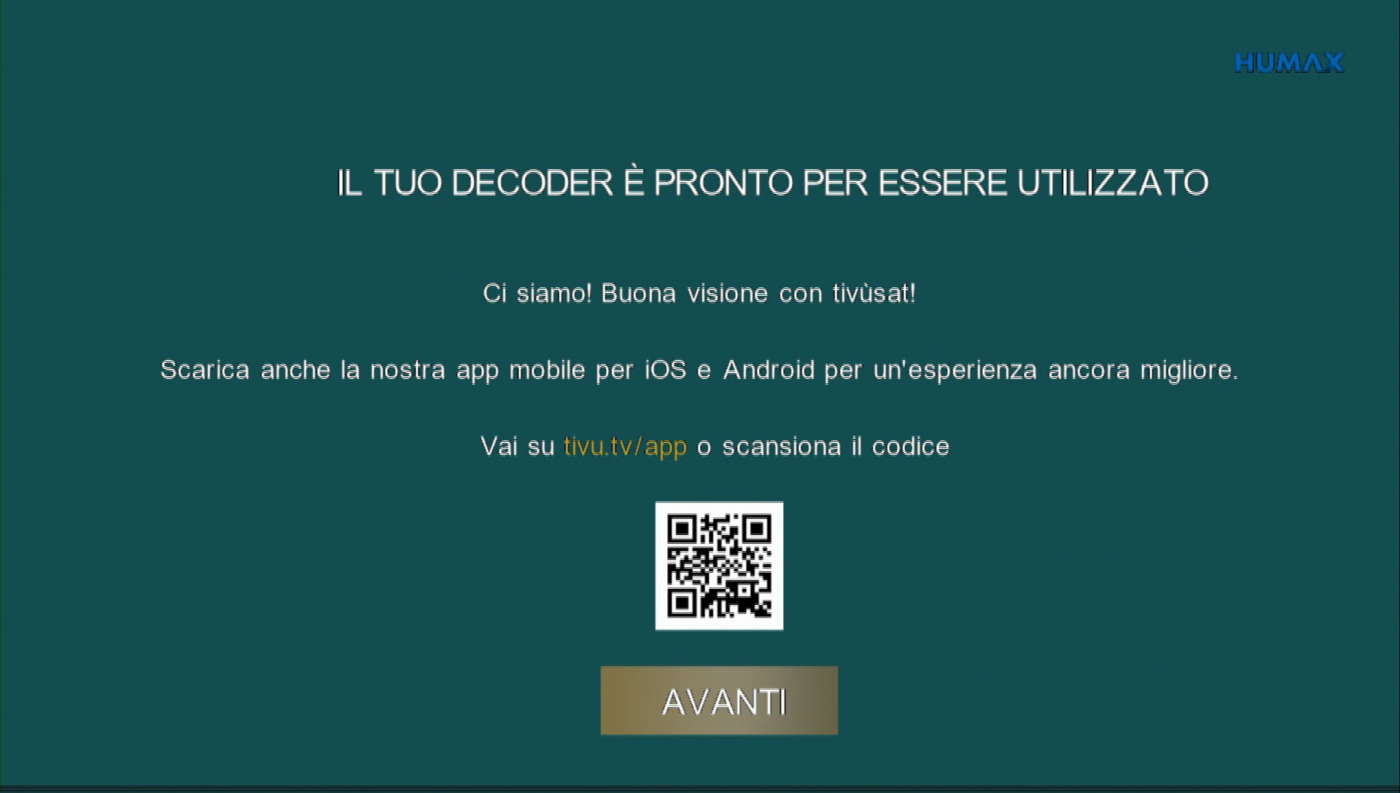 Dopo aver creato il codice PIN (es.: 0000), si procede con la configurazione della parabola (satellite, LNB, tipo antenna, banda e frequenza SCR/dCSS, ecc. – i valori per un’antenna fissa puntata a 13° Est sono predefiniti e non vanno modificati) ed infine alla ricerca dei canali (es.: Tivù + in chiaro). Conclusa anche questa fase, il decoder cerca su internet un eventuale aggiornamento firmware, fornisce tutte le informazioni per l’attivazione della tessera tivùsat, suggerisce il download della app tivùsat per iOS/Android (con tanto di codice QR da fotografare con lo smartphone) e si posiziona sul primo canale della piattaforma (Rai 1 HD).