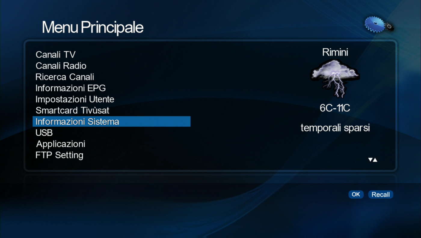 Il menu OSD è stato studiato per semplificare al massimo la navigazione all’interno dei vari sottomenu: Canali Tv, Canali Radio, Ricerca Canali, Informazioni EPG, Impostazioni Utente, Smartcard Tivùsat, Informazioni Sistema, USB, Applicazioni, FTP Setting. Niente effetti speciali, colori o icone dinamiche ma un semplice elenco di voci, facili da identificare e modificare in caso di necessità. La parte destra del menu principale è occupata dalle informazioni meteo della località impostata nell’omonima app (stato del cielo, temperatura minima e massima).