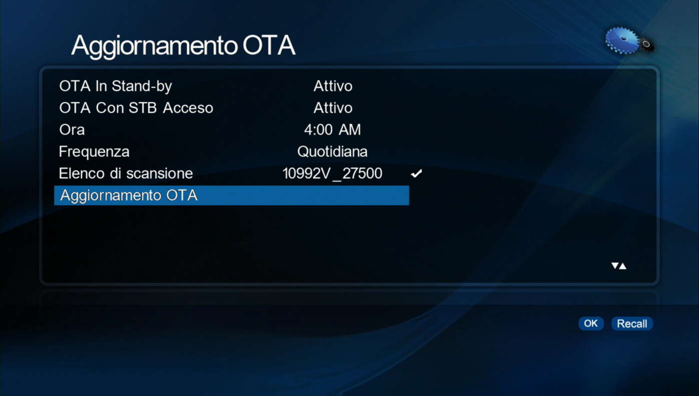 È altresì possibile riportare il decoder ai dati di fabbrica e configurare gli aggiornamenti manuali e automatici di canali e firmware (voci Aggiornamento OTA/Aggiornamento Canali – con decoder acceso o in standby, all’orario desiderato e con frequenza giornaliera o settimanale).