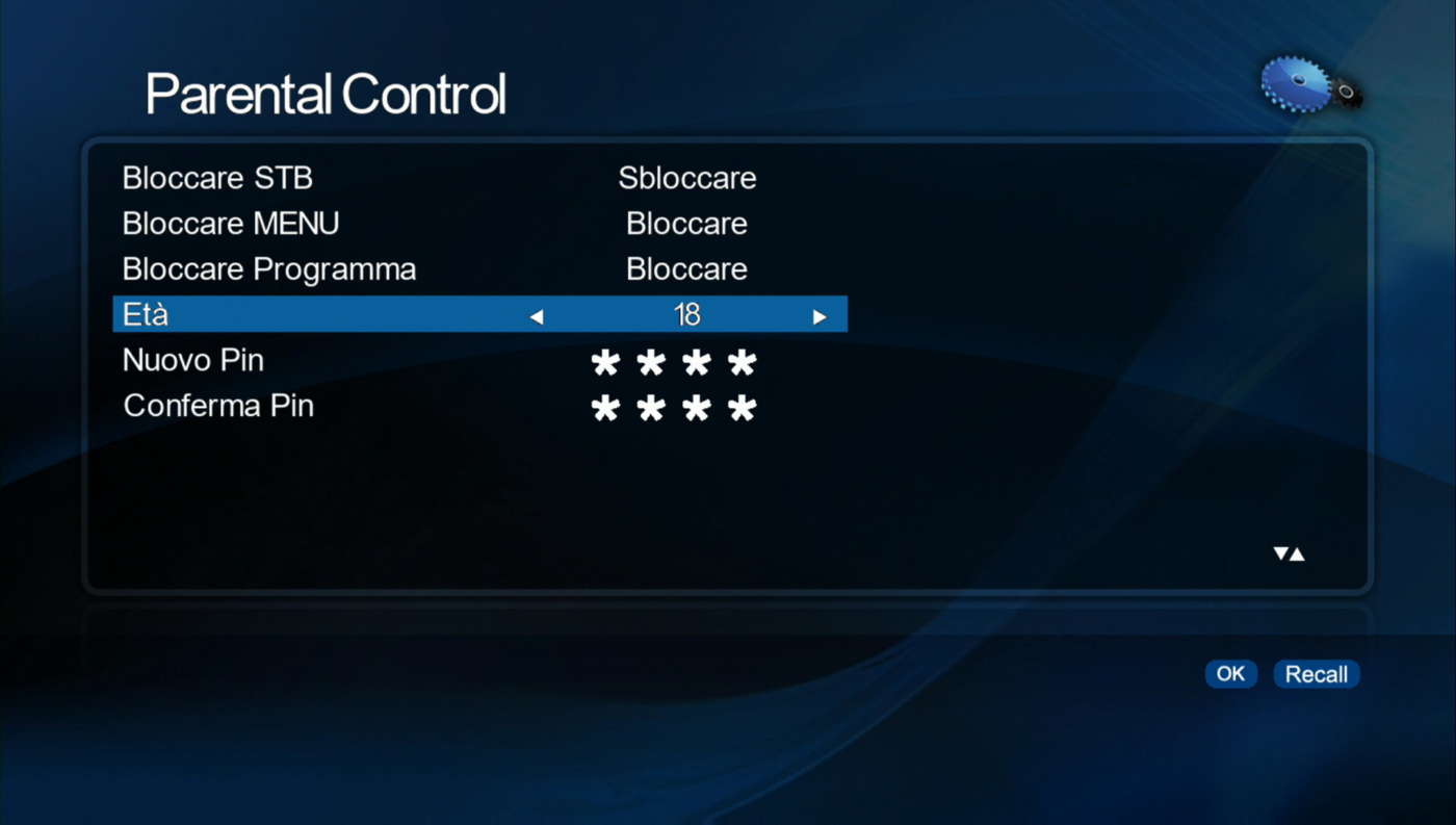 Impostazioni utente racchiude i principali strumenti e settaggi dei Tivumax LITE/LT come l’editing dei canali Tv e radio (blocco, skip, cancellazione, modifica nome e posizione ma solo con LCN disattivata), le impostazioni audio e video (formato schermo e immagine, risoluzione HDMI e altri), le lingue (menu, audio, sottotitoli, audiodescrizione), gli eventi timer (promemoria), il Parental Control (blocco decoder, menu e programmi con PIN numerico), lo standby automatico (3 ore oppure spento).