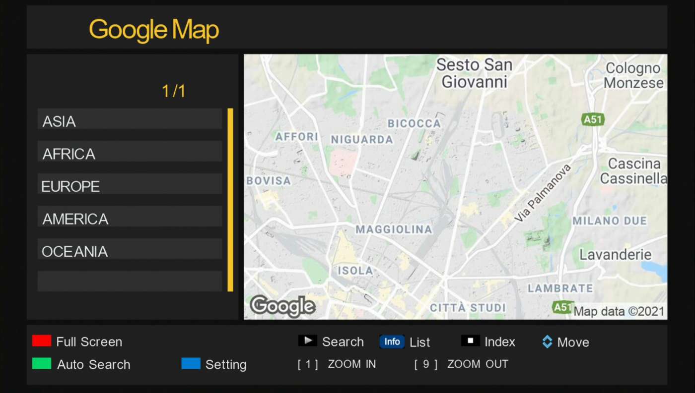 Google Map è il classico adattamento della famosa app di Google per i decoder digitali: mostra le immagini satellitari, stradali, ibride e terrene di una qualsiasi località nazionale e internazionale, con tanto di motore di ricerca (manuale o automatico), cronologia, zoom, full-screen e scorrimento nelle quattro direzioni.