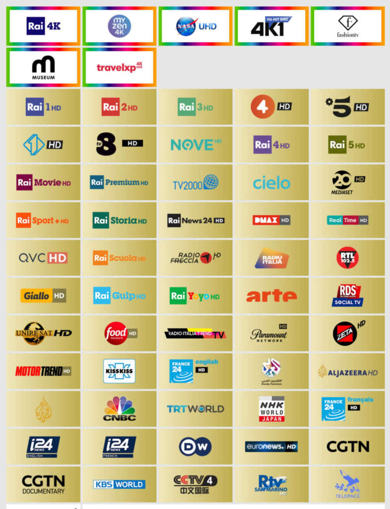 Ha anche ospitato in esclusiva i primi canali HD italiani e permesso la nascita e l’affermazione di Rai 4K. Ogni giorno, milioni di italiani che possiedono una normale parabola da 60-80 cm puntata su Hot Bird (anche la stessa di Sky), un decoder oppure una CAM inserita in un TV con sintonizzatore satellitare, possono guardare ed ascoltare gli oltre 180 canali radiotelevisivi di tivùsat, 55 dei quali in HD, 7 in 4K e decine di radio.